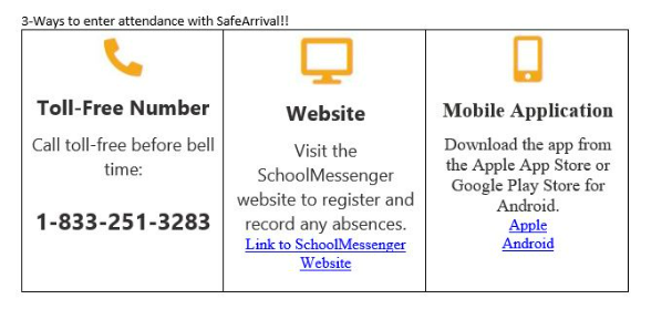 Please report absences in advance using SafeArrival instead of sending notes or calling/emailing the school.