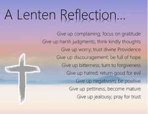 - We have six weeks to focus on Lent – a time to turn to God in all we do. As a daily reflection, we ask ourselves what we need to stop doing or start doing to be the person God has created to us be. We are called to uphold 3 pillars – to pray, to fast, and to give to those in need. Fasting can also be fasting from habits – not just food. God bless you all this Lenten Season. Here is